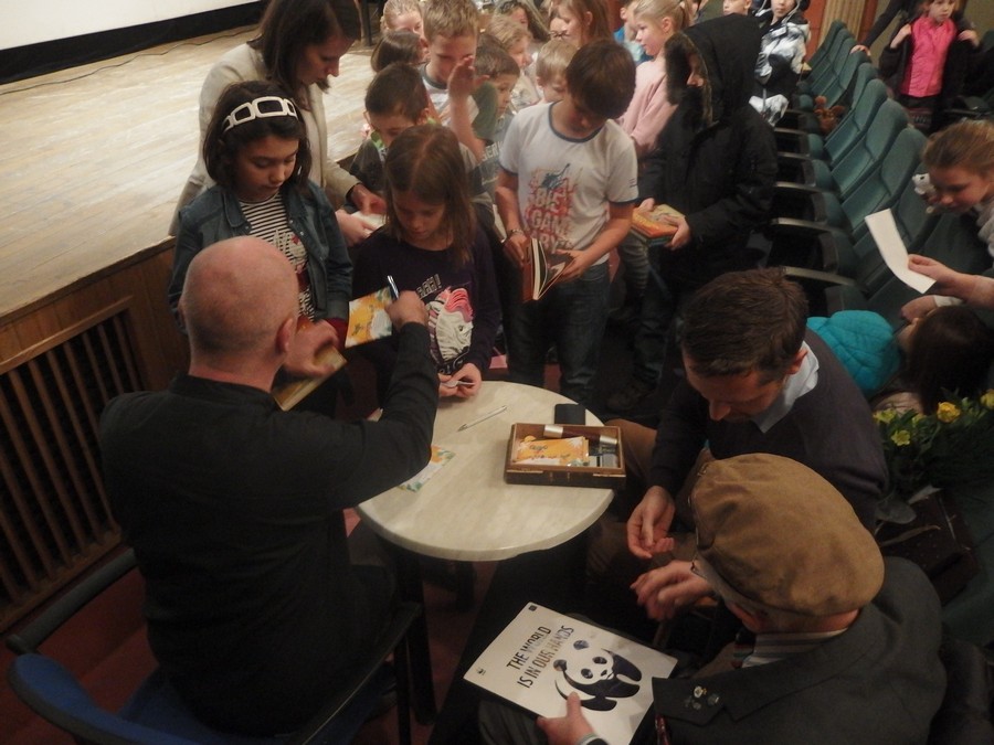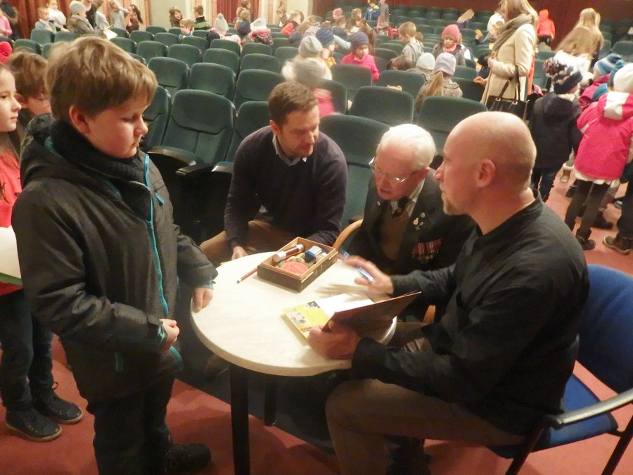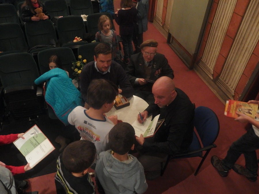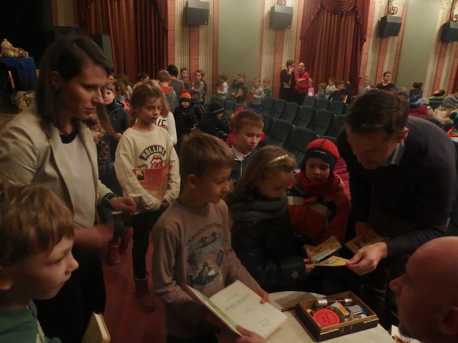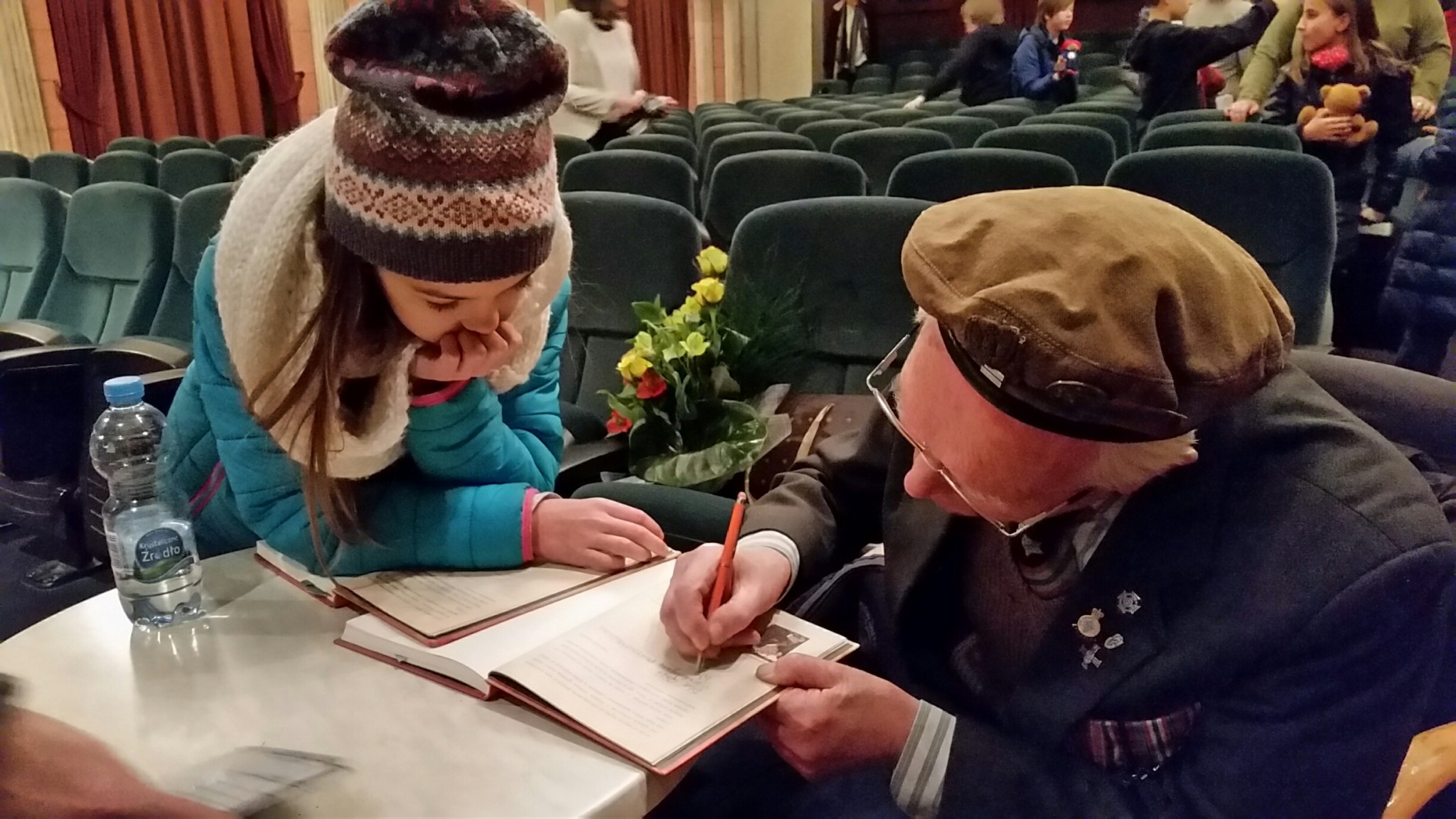 - Prof. Narębski signs the Wojtek book for Zosia Kańtoch (grade 3). (photo: Łukasz Kańtoch)