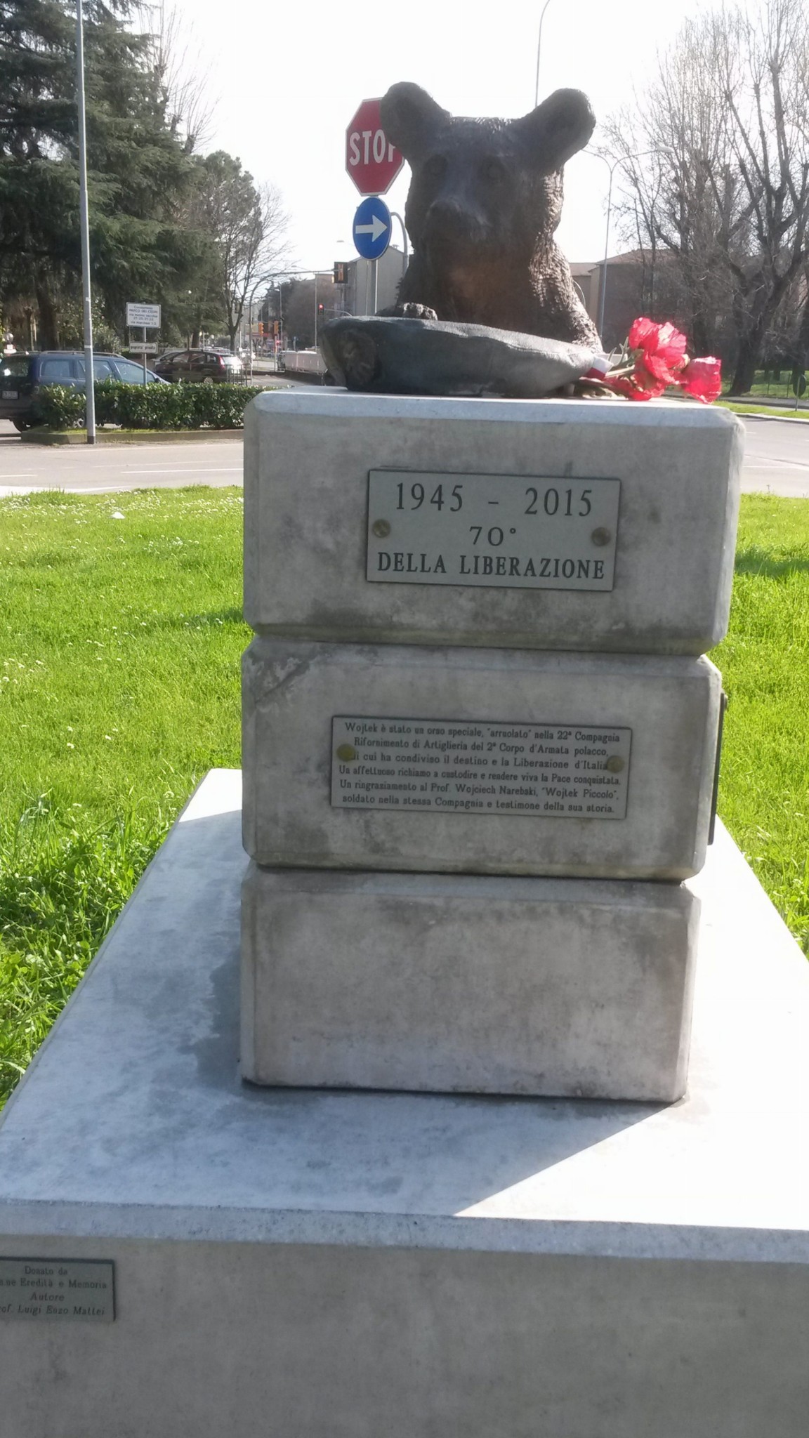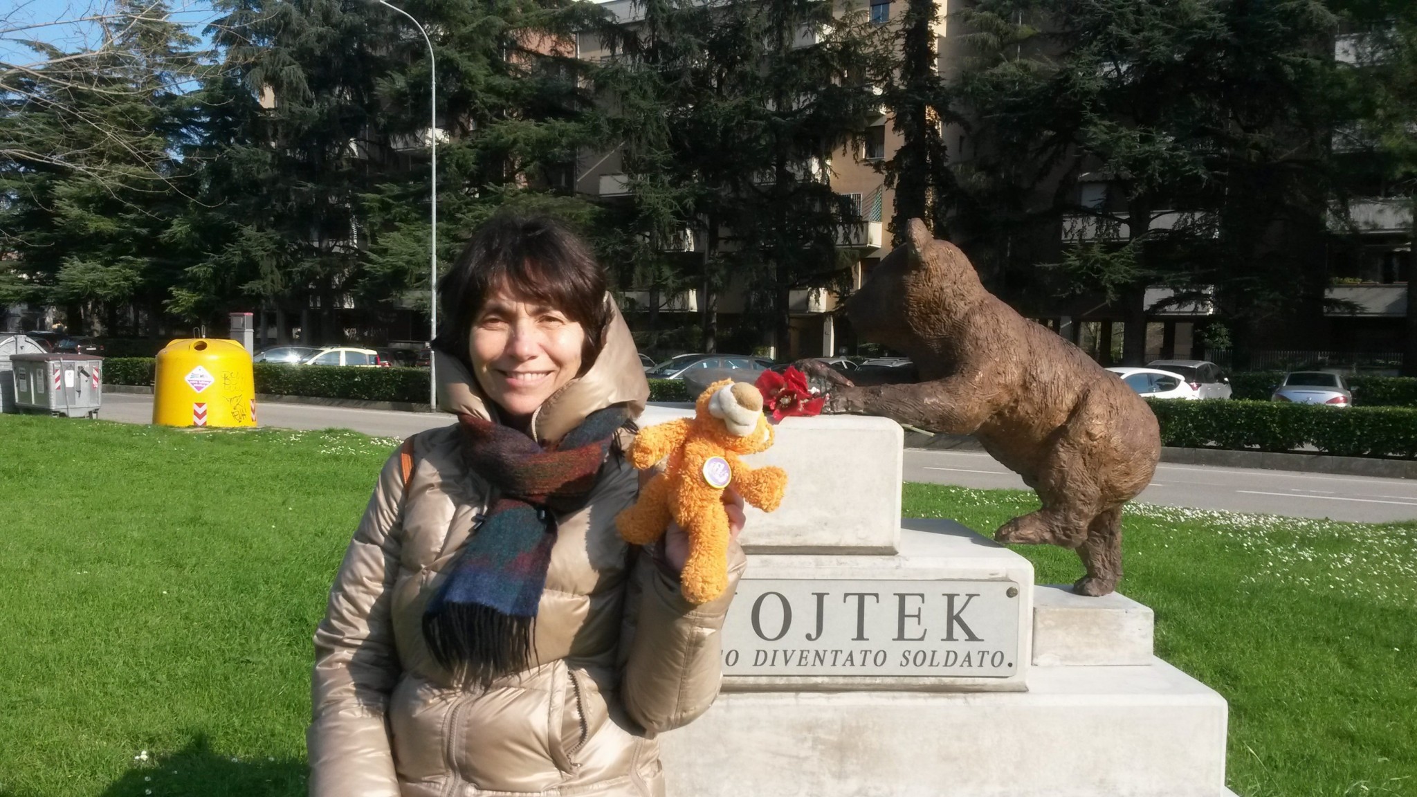 Ms Rita Visani took Wojtek to Imola. It was a real travel in time because Imola is the town whose liberation he saw during World War II. Here he is by the statue that commemorates his unique story.
