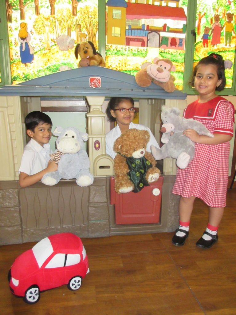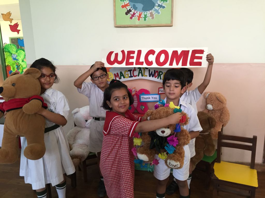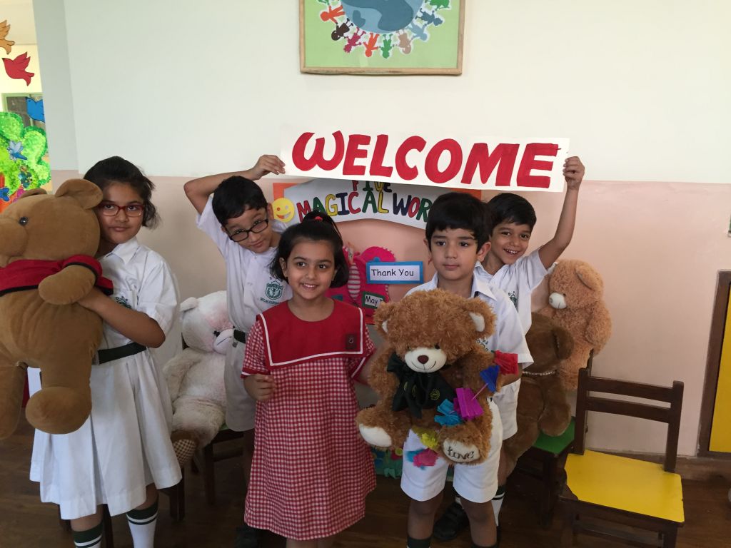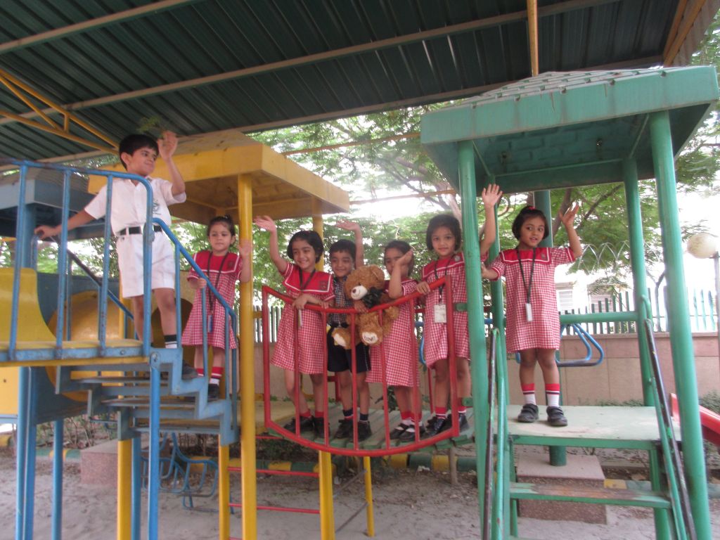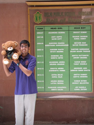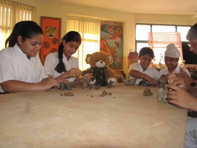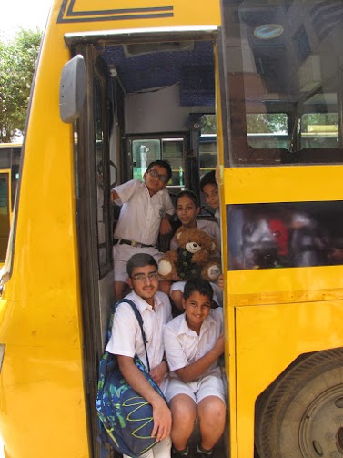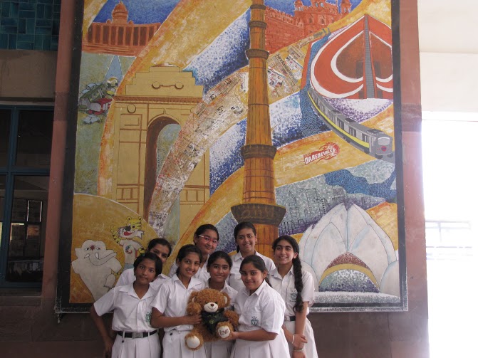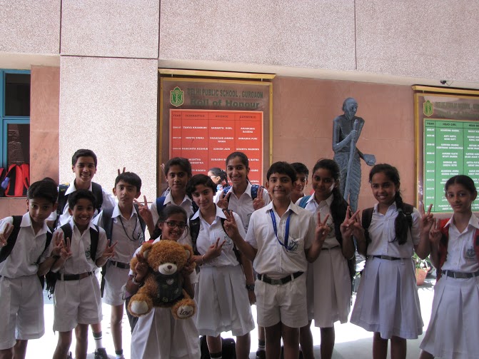 Wojtek spends a day at Delhi Public School, Gurgaon, India, and is wearing the school scarf. With to Ms Mamta Kumar, he went to the Infant, Middle and Senior Wings of the school and made a lot of new friends. He even got to travel on the yellow school bus.